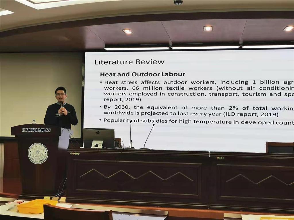主讲人李嘉楠副教授报告了其与合作者撰写的工作论文《Temperature and Outdoor Productivity: Evidence from Professional Soccer Player》。在全球气候变暖的背景下,气温上升与经济活动的关系受到日益广泛的关注。文章以足球运动这一特殊的服务业为研究切入点,基于2014到2018年中超联赛888个足球员运动员比赛数据,考察气温对室外生产率以及运动员长期人力资本积累的影响。