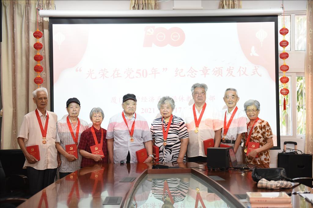 6月17日上午,厦门大学经济学院经济学系离退休教工党支部“光荣在党50年”纪念章颁发仪式在校离退休处二楼会议室隆重举行。今年获得“光荣在党50年”纪念章的经济学系离退休老同志有(以党龄为序):蒋绍进、李圭璋、周妙群、方成族、陈光汉、黄其昌、黄美莺、许经勇、李绪蔼等,其中年龄最长蒋绍进教授现年94岁,党龄73年。经济学院党委书记黄鸿德代表学院党委向他们颁发纪念章。