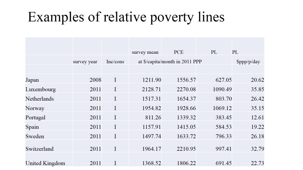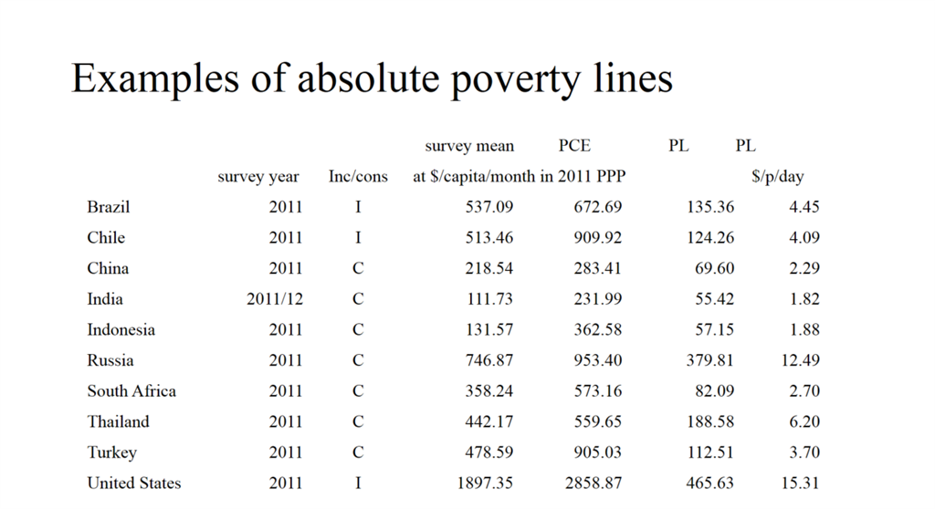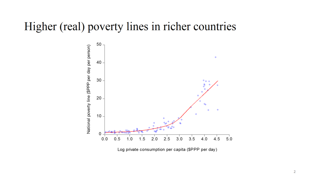 那么,中国在现行标准下,我们今年全面脱贫以后,在2020年以后我们所面临的新的挑战,是我们可能会从测量绝对贫困到相对贫困,或者说把绝对的贫困标准进一步的提高。我这里有几张图,你能看出随着国民收入平均程度的增加,国家所定的贫困线是越来越高的,这是在全世界我们能看到的一个趋势。