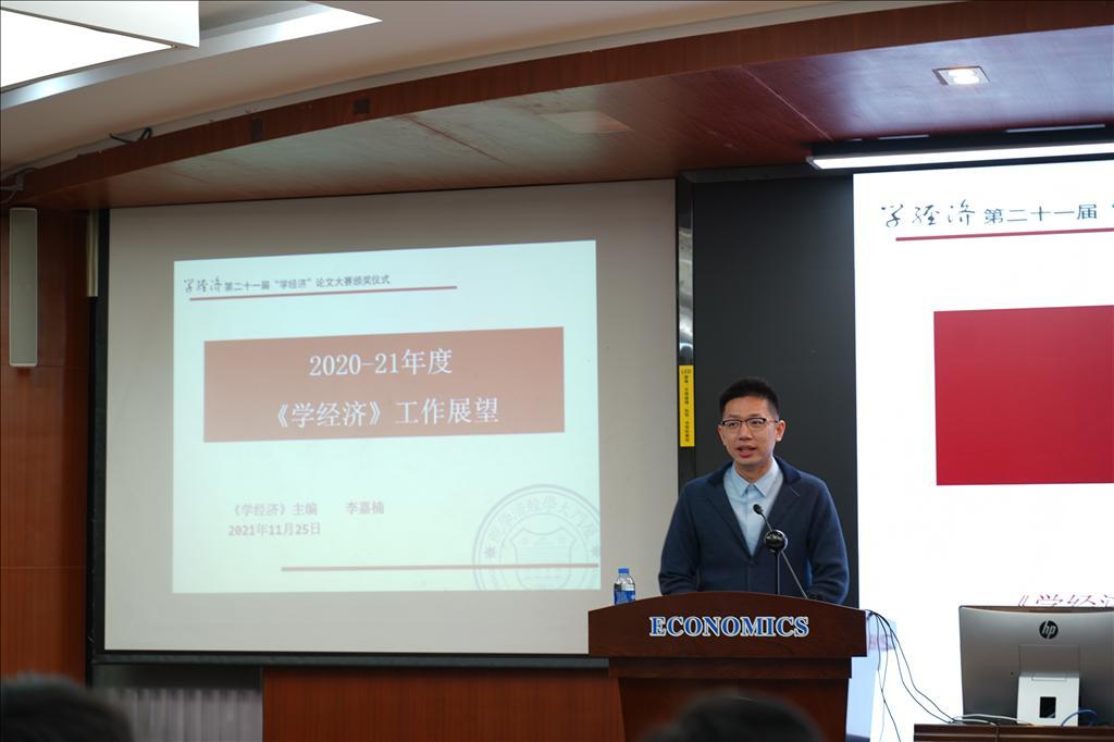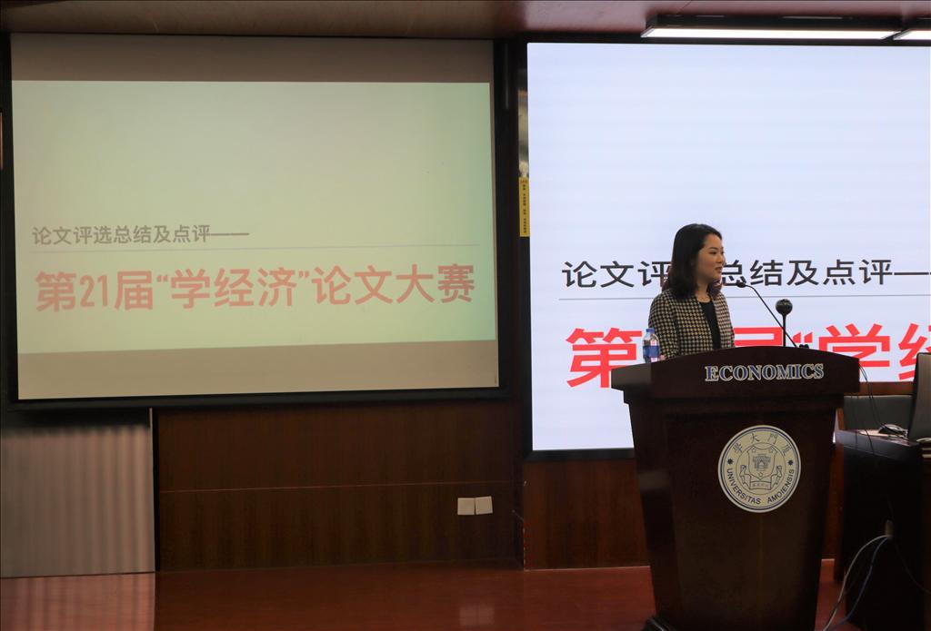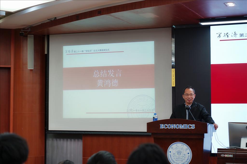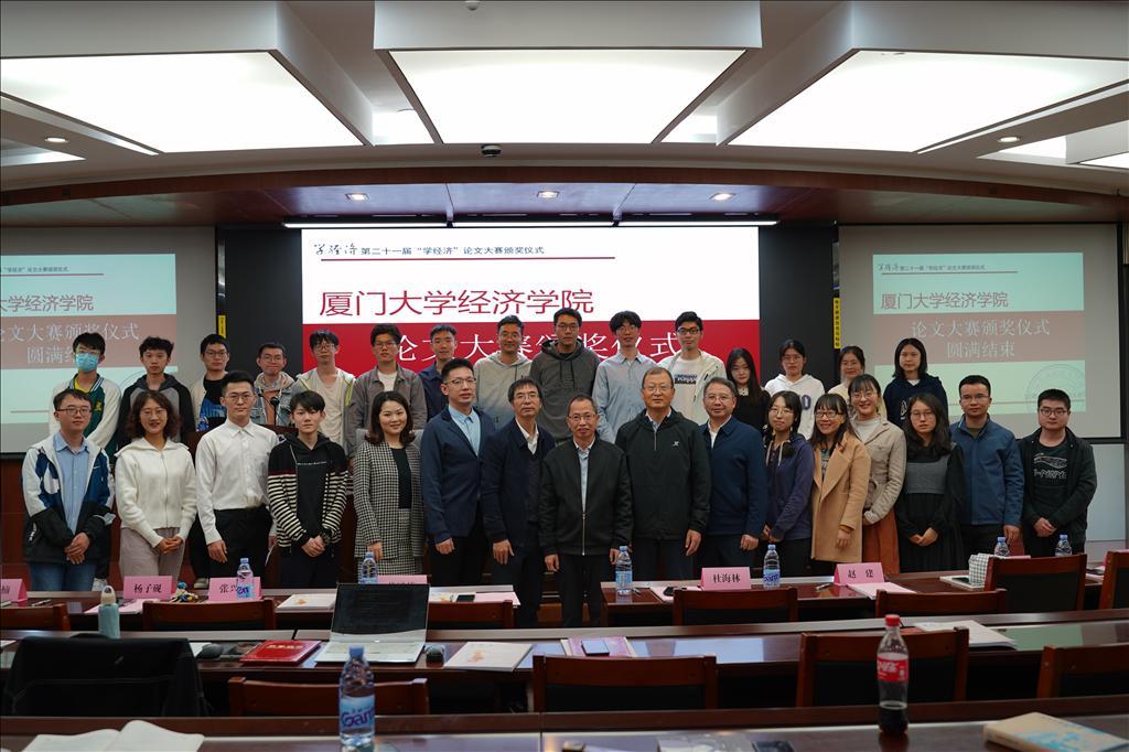 11月25日中午,经济学院第二十一届“学经济”论文大赛颁奖仪式在经济学院N302顺利举行。大赛由厦门大学经济学院、厦门大学国家经济学基础人才培养基地主办,厦门大学经济学院习近平新时代中国特色社会主义思想读书社、厦门大学马克思主义政治经济学学习社、厦门大学《资本论》研习社承办。颁奖仪式由《学经济》编辑部执行主编宋凝曦同学主持。经济学院党委书记黄鸿德、党委副书记杜海林、经济学系代系主任,经济学系教师党支部书记张兴祥、经济学系副主任赵建、经济学院团委书记刘莉颖、经济学系副教授李嘉楠、助理教授杨子砚出席颁奖仪式。