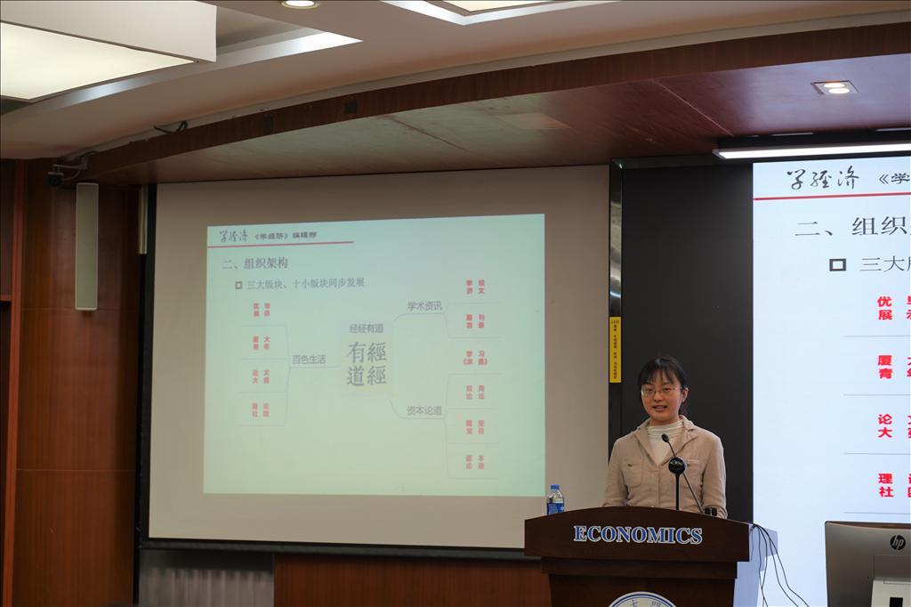 《学经济》编辑部执行主编崔畅同学介绍了《学经济》一年来的发展情况。这一年,《学经济》在构建思政教学阵地、打造前沿科研平台、结合新媒体传播手段等方面都取得了较大的发展和进步。截止11月23日,“经经有道”公众号研讨会推文突破100篇大关,总推文达354篇,累计阅读152571次,吸引89204人次阅读,形成了一定的规模和影响范围。其中,推出的视频板块更是得到了积极反响。同时,编辑部的学生培养也取得了卓越成果,2017-2021年保研率100%,2021年值班编辑分别去向北大、人大、复旦、浙大、南开等知名学府。最后,《学经济》也在为创建国内一流学生学术交流的媒体平台而不断努力。