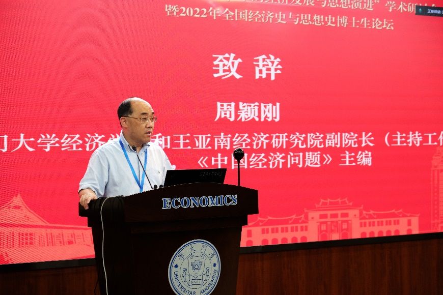 周颖刚在致辞中代表厦门大学经济学科对莅会嘉宾表示热烈欢迎,他谈到,在建党新百年之际学习历史具有重要意义,历史是最好的教科书,也是最好的营养剂和清醒剂。厦门大学经济学科在经济史和经济思想史的发展上历久弥新,期待通过研讨会的举办,厦门大学经济学科能与各位专家学者一起,牢牢抓住历史机遇,共同见证中国经济史和经济思想史的蓬勃发展。