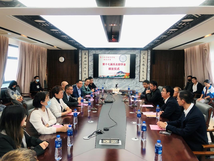 2022年12月1日中午,经济学院在经济楼N501举行福建省首个数字人民币助学金——经济学系第十七届系友助学金颁发仪式。经济学院党委副书记杜海林,经济学系系主任张兴祥,经济学系系副主任李嘉楠,经济学系教师代表许梦涵,1992级班主任郭其友,系友代表连任、张云龙、邱鹭、朱艺楚、陈淑卿、谢荣华、许限柏出席本次颁发仪式。仪式由经济学院辅导员蔡庆淞主持。