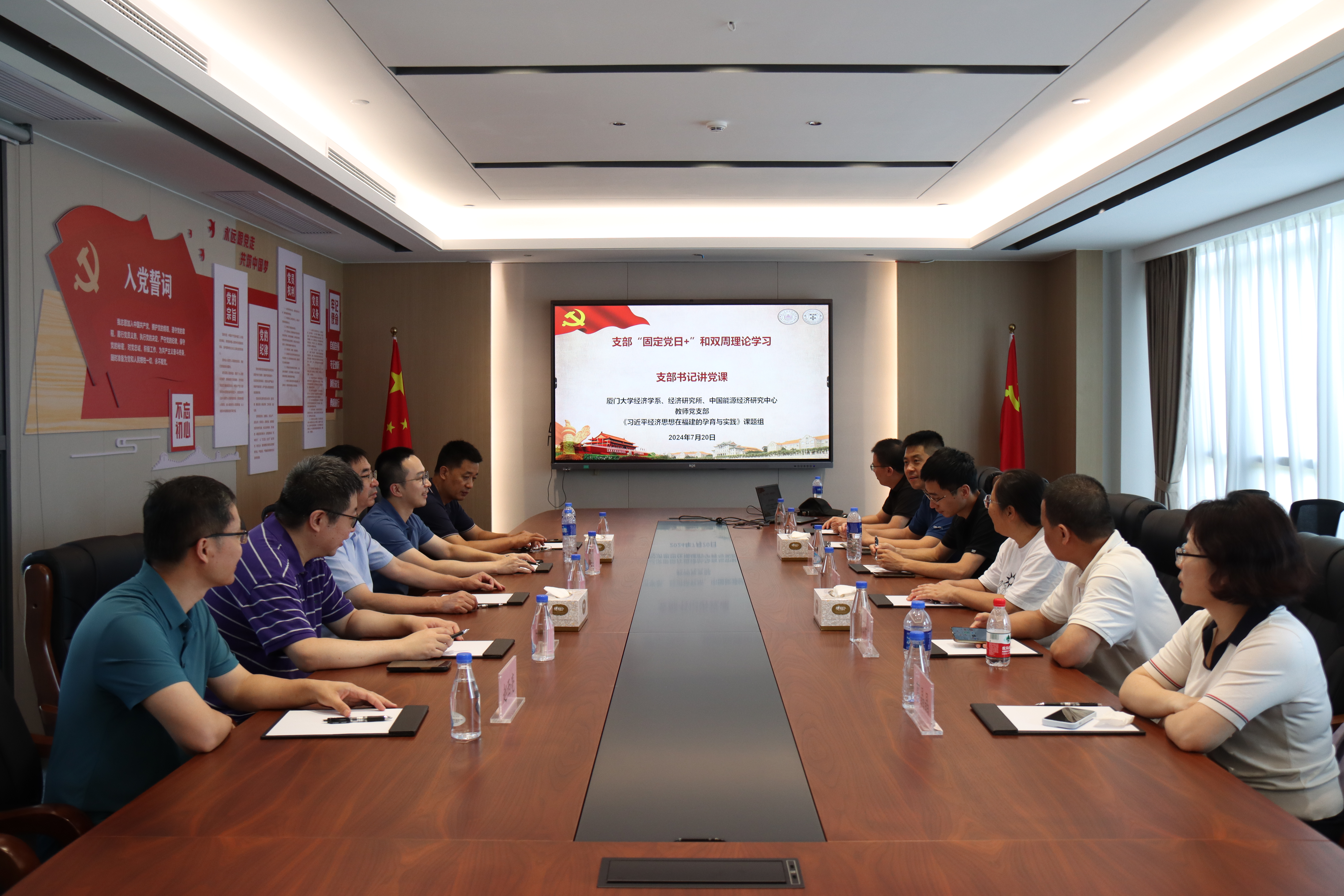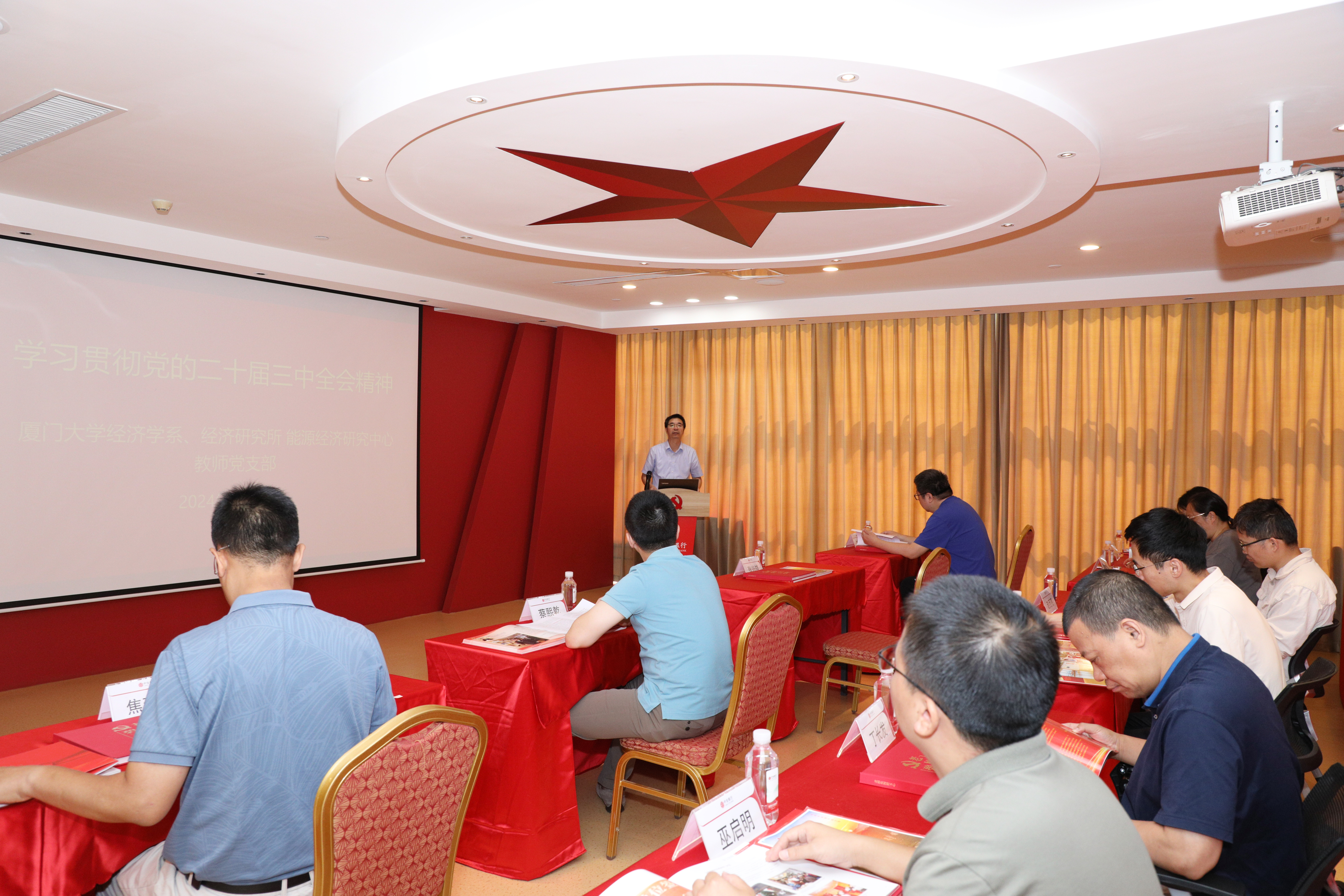 张兴祥教授,厦门大学国际合作与交流处副处长兼台港澳事务办公室副主任、经济研究所所长蔡熙乾教授,以及中国能源经济研究中心教师党支部书记、主任姚昕教授,分别带领全体与会党员认真学习党的二十届三中全会精神。